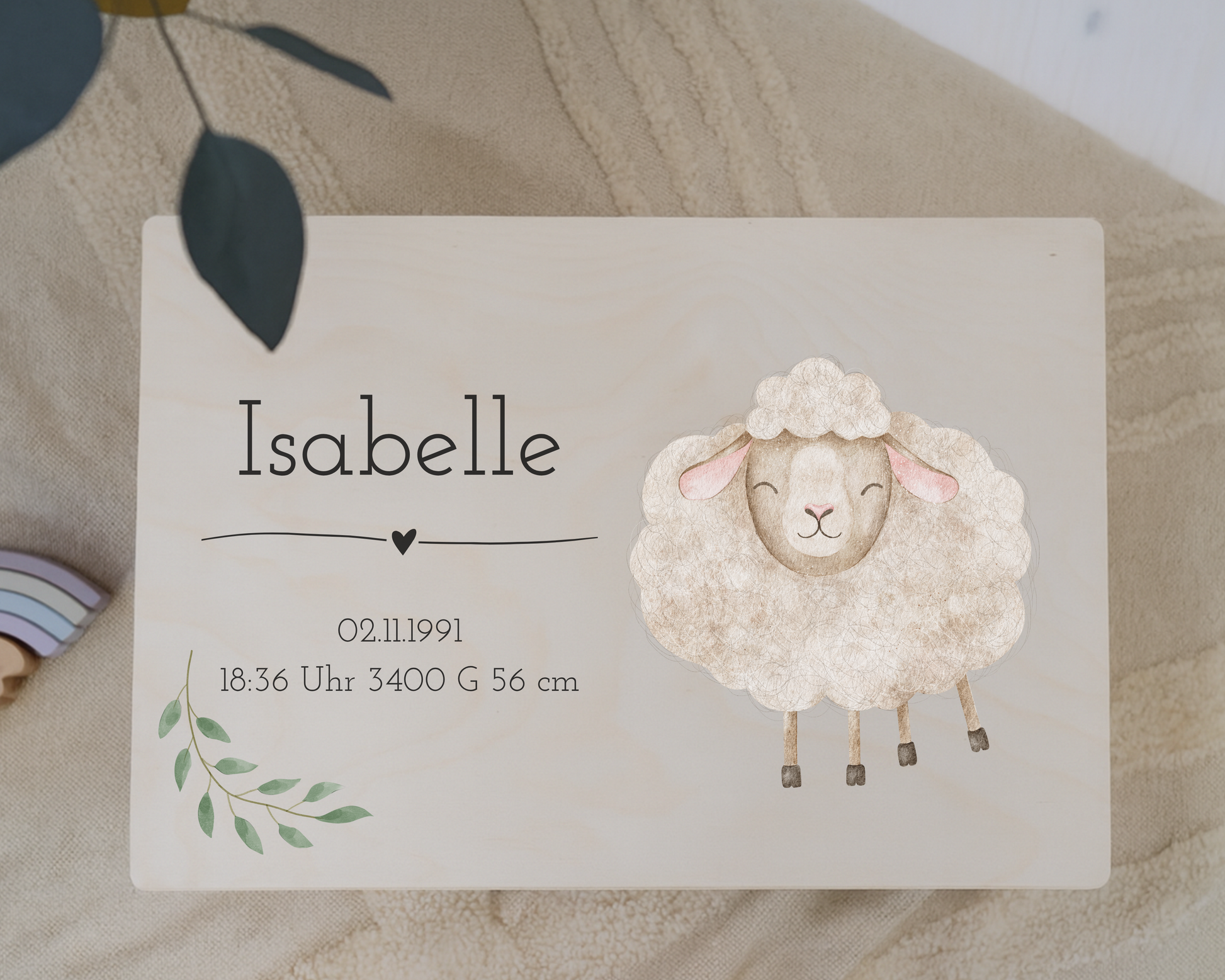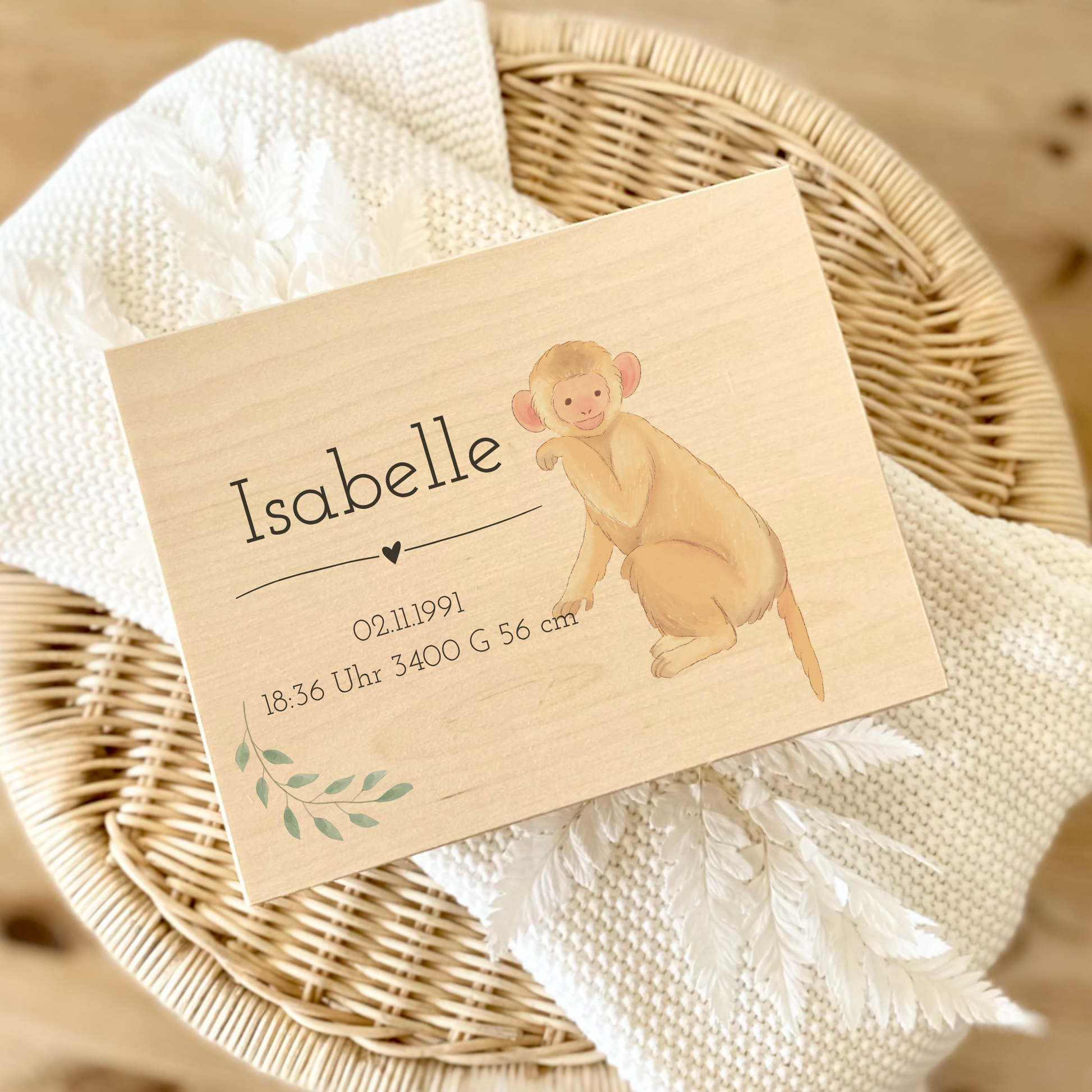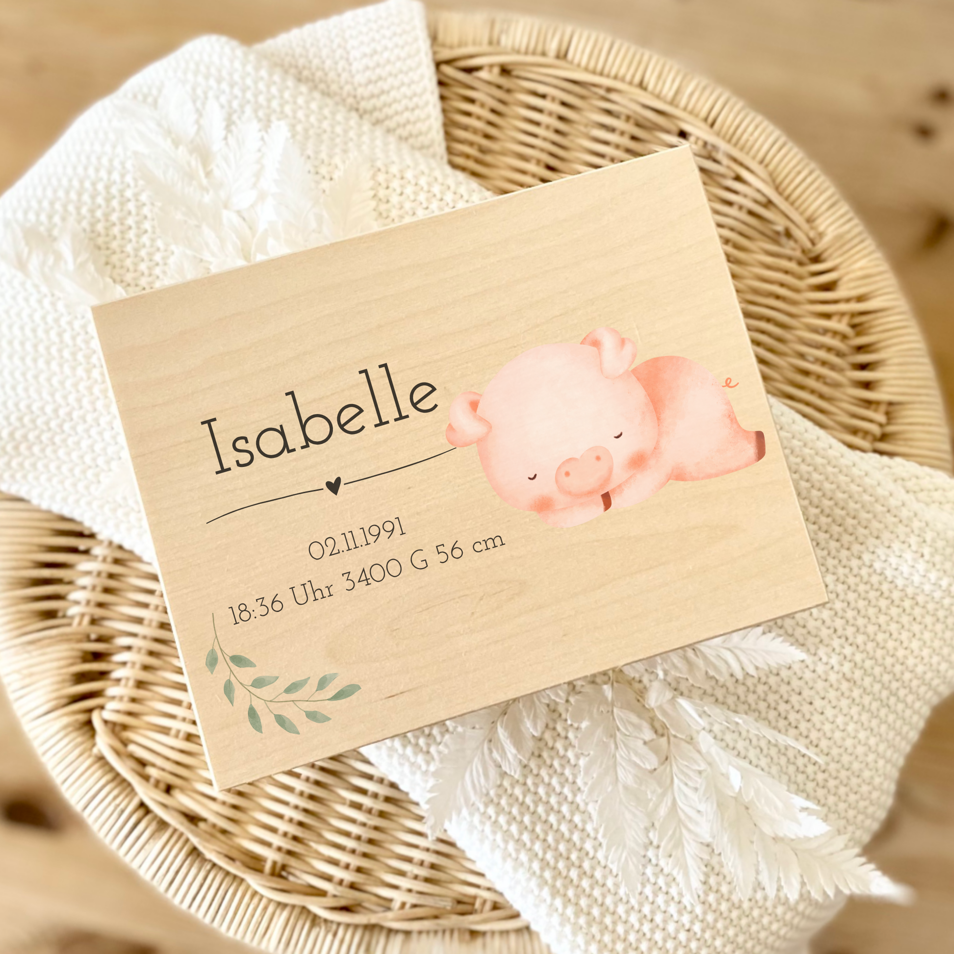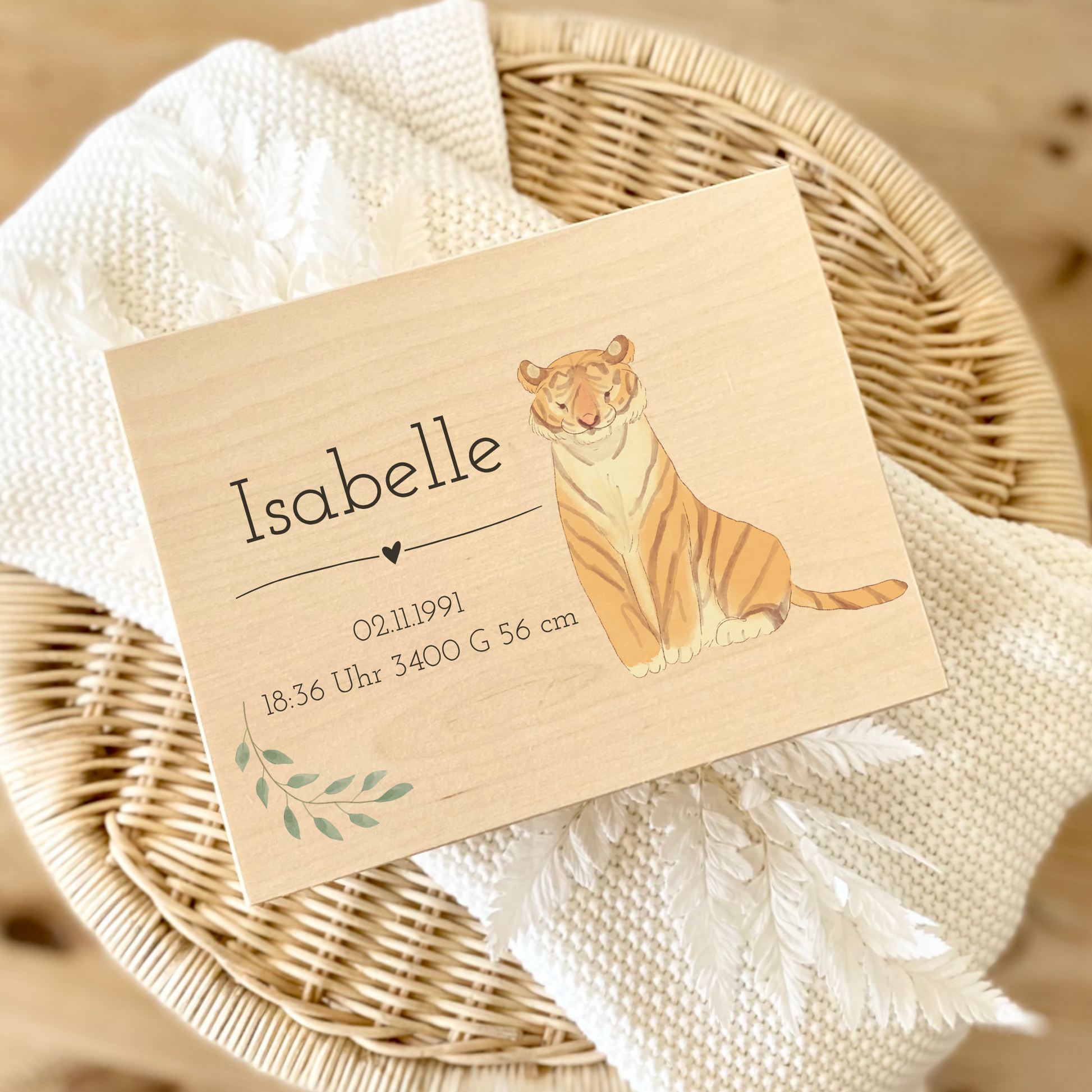 Diese hochwertig verarbeitete Holzkiste ist ein liebevolles Geschenk zur Geburt, Taufe oder zum Kindergeburtstag. Der Deckel wird mit dem Namen des Kindes, den Geburtsdaten und einem liebevoll illustrierten Tier gestaltet: dezent, stilvoll und ganz persönlich.