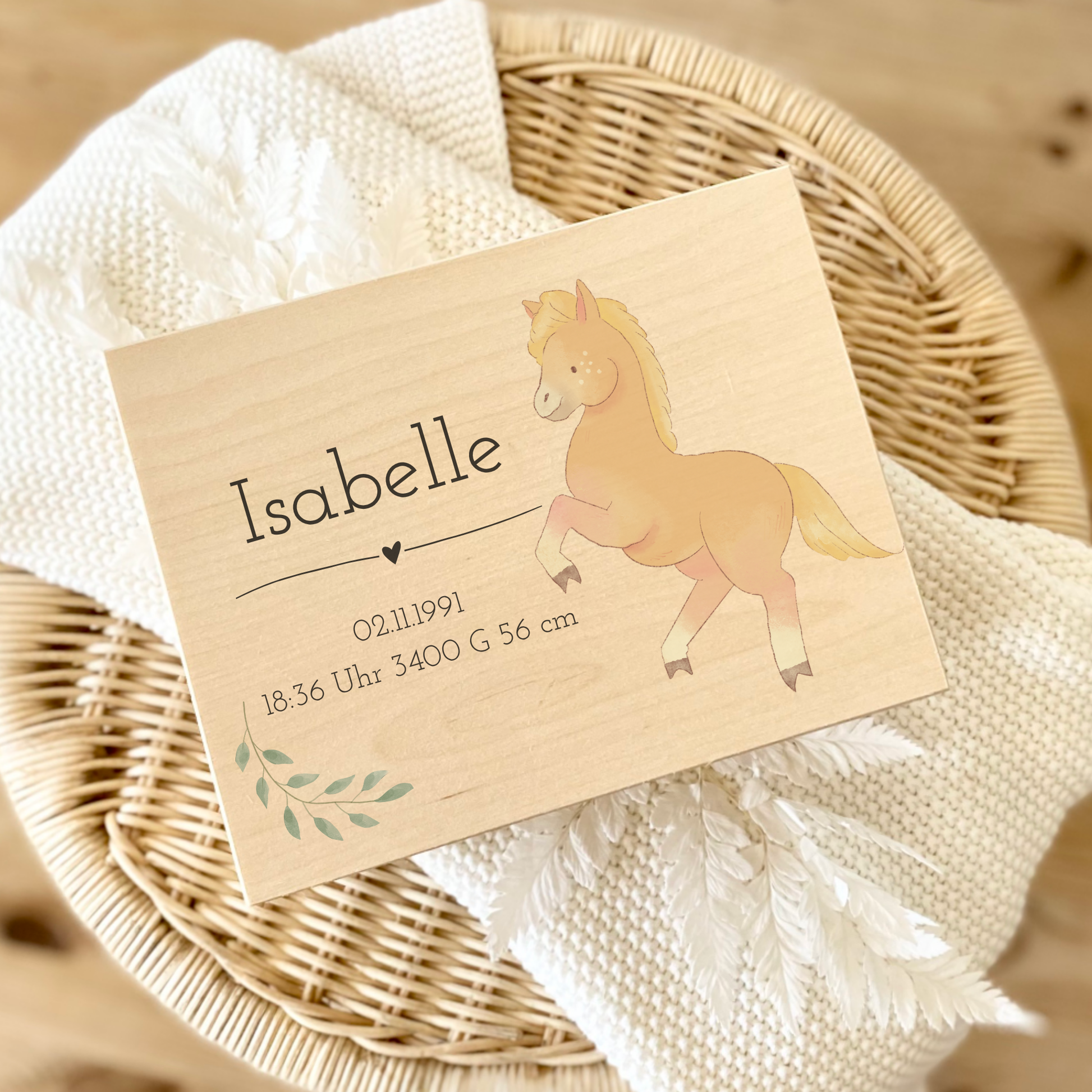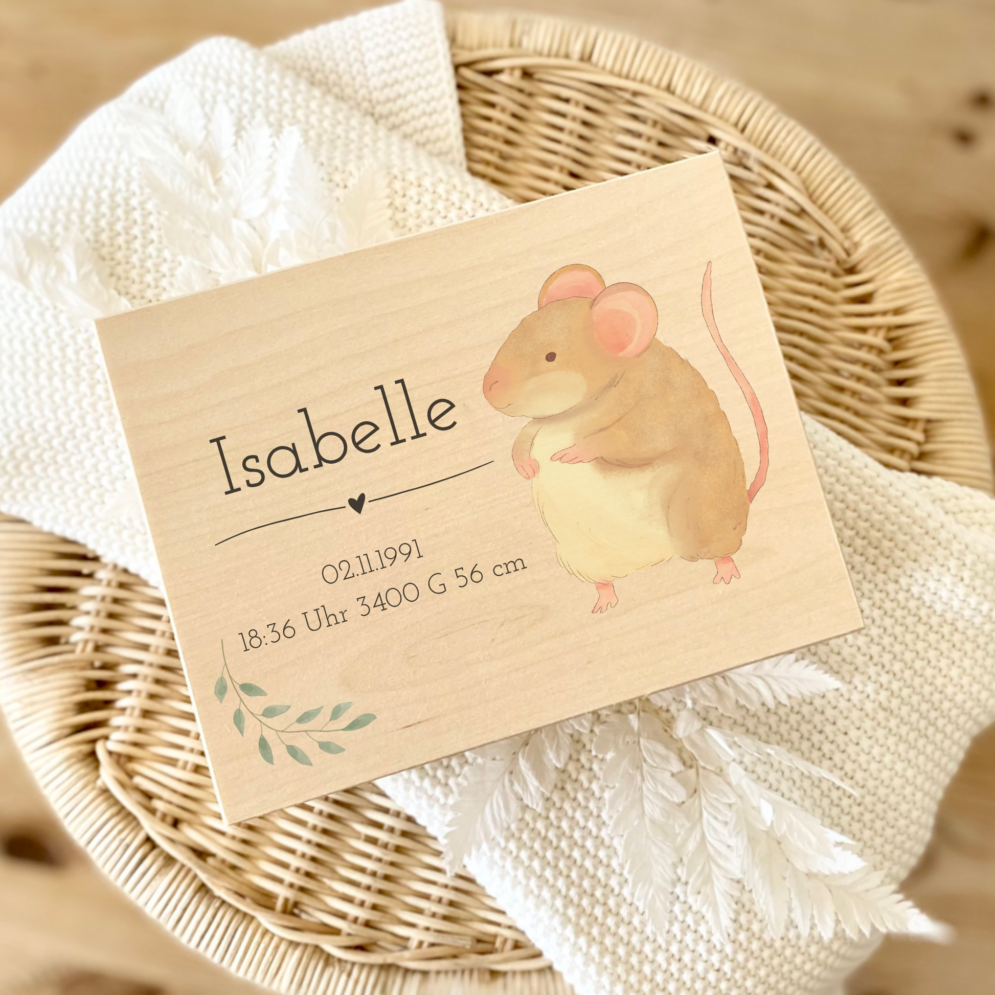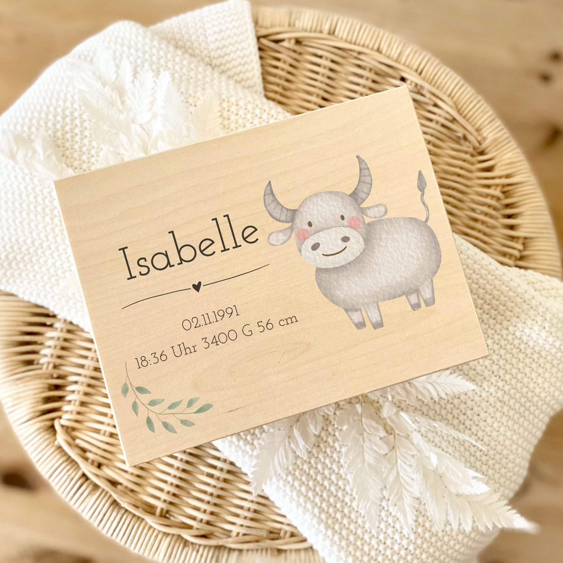 Diese hochwertig verarbeitete Holzkiste ist ein liebevolles Geschenk zur Geburt, Taufe oder zum Kindergeburtstag. Der Deckel wird mit dem Namen des Kindes, den Geburtsdaten und einem liebevoll illustrierten Tier gestaltet: dezent, stilvoll und ganz persönlich.