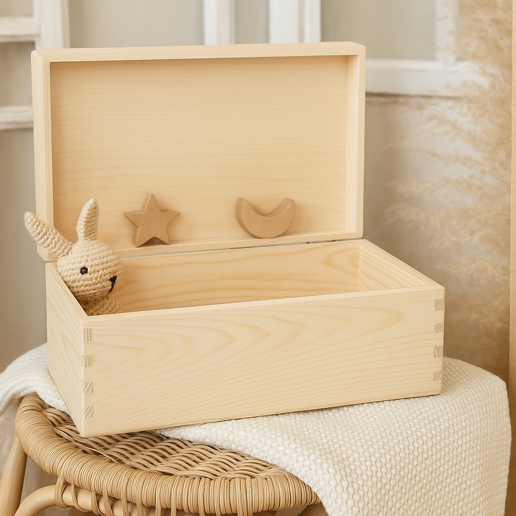 Die Box ist ideal zur Aufbewahrung besonderer Erinnerungen: das erste Armbändchen, der Lieblingsschnuller, Fotos oder kleine Andenken. Ob für dich selbst oder als Geschenk – sie schafft einen Platz für das, was bleibt.