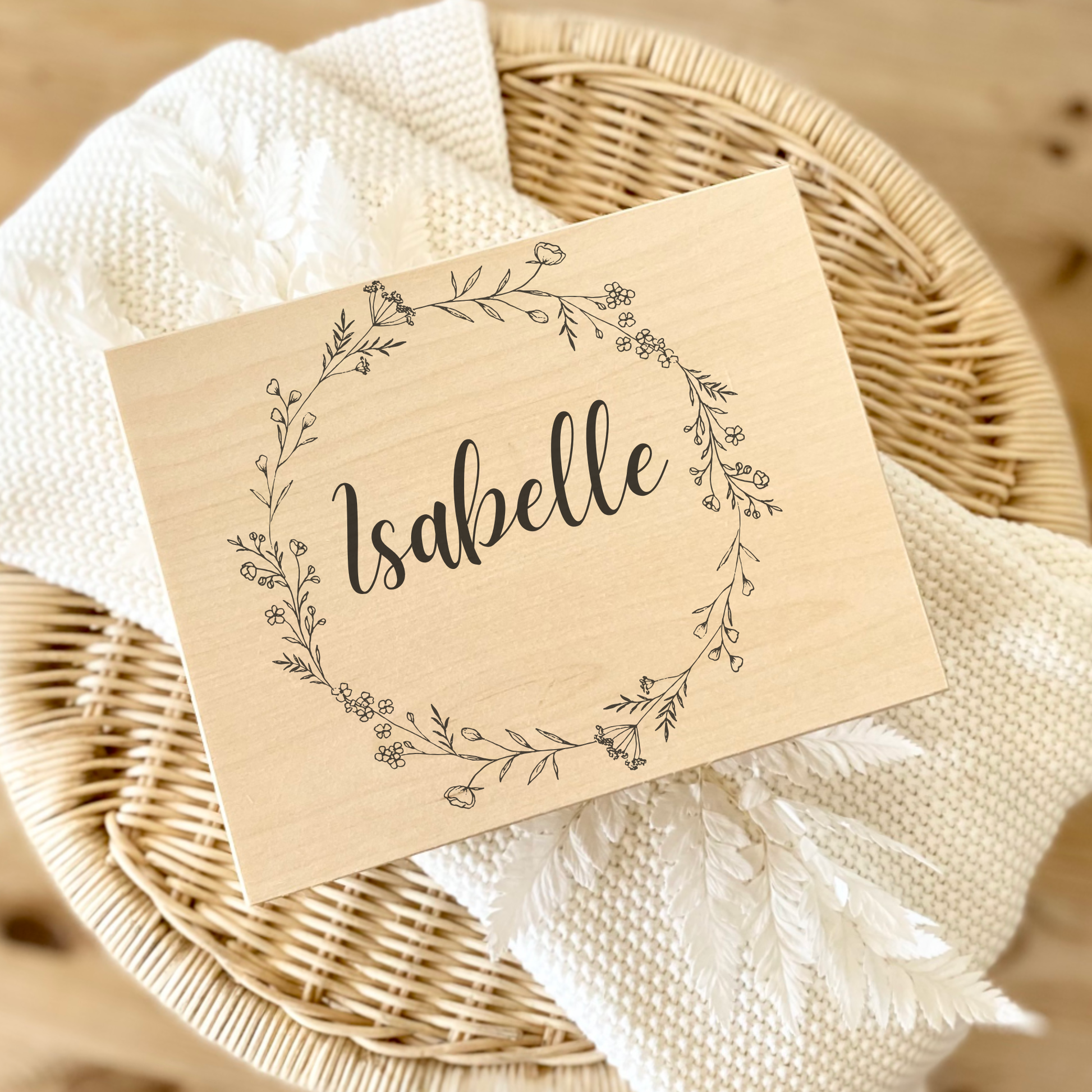 Personalisierte Holzkiste mit Kranz & Name – Erinnerungskiste Geschenk