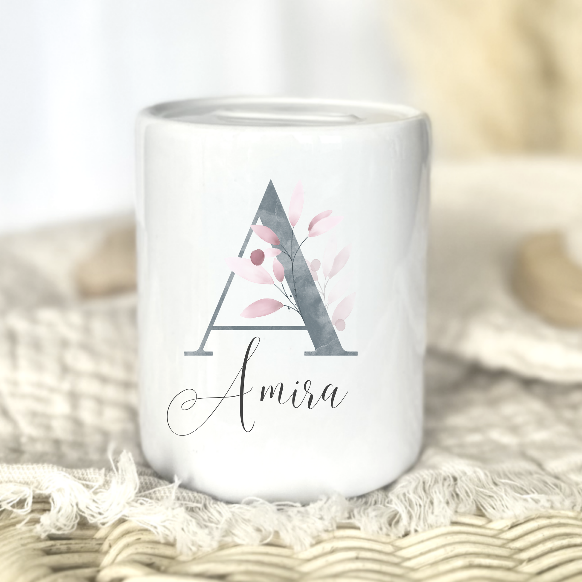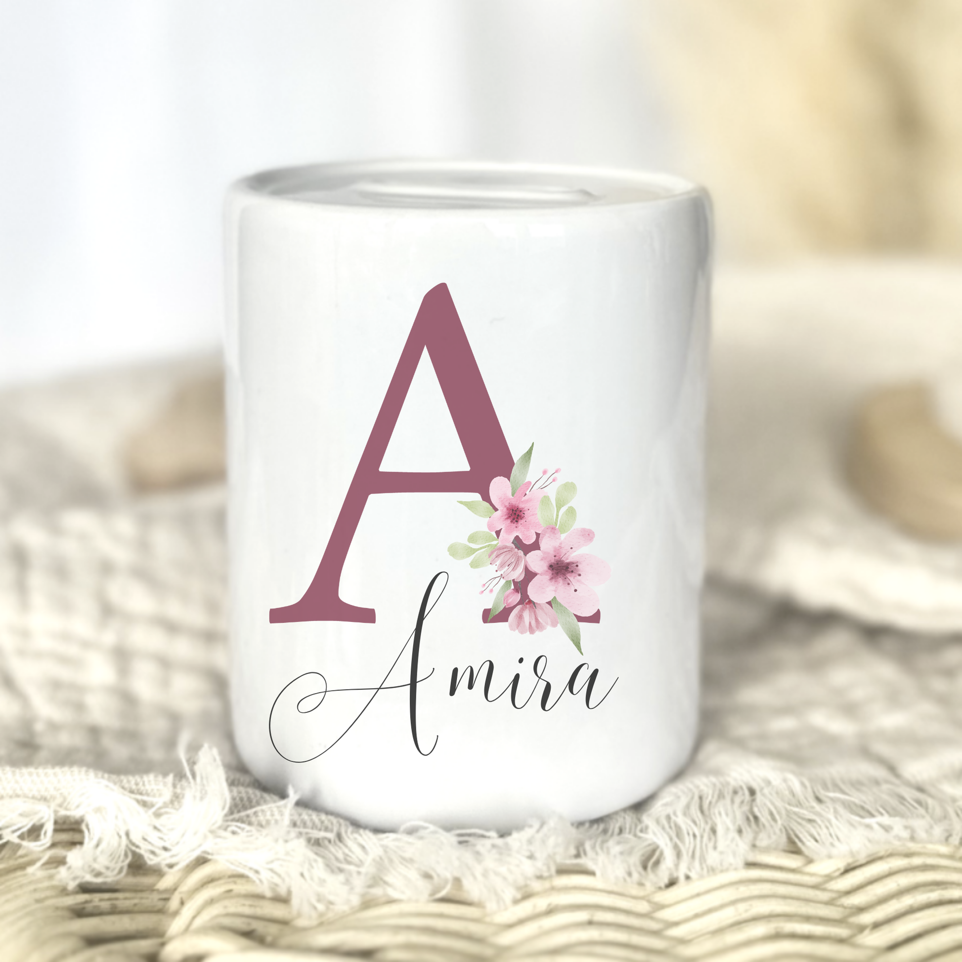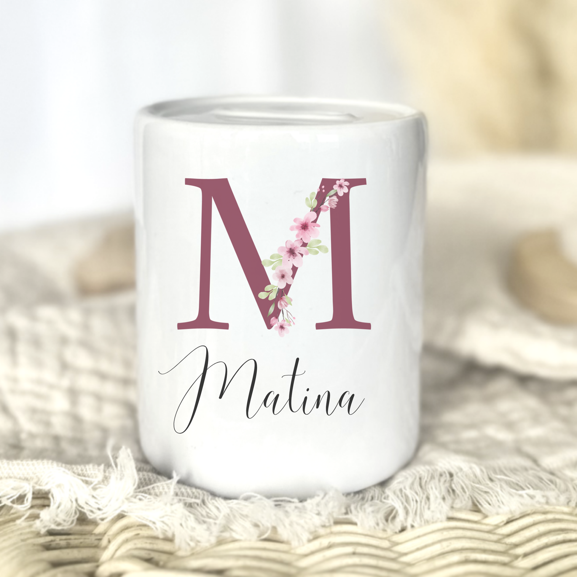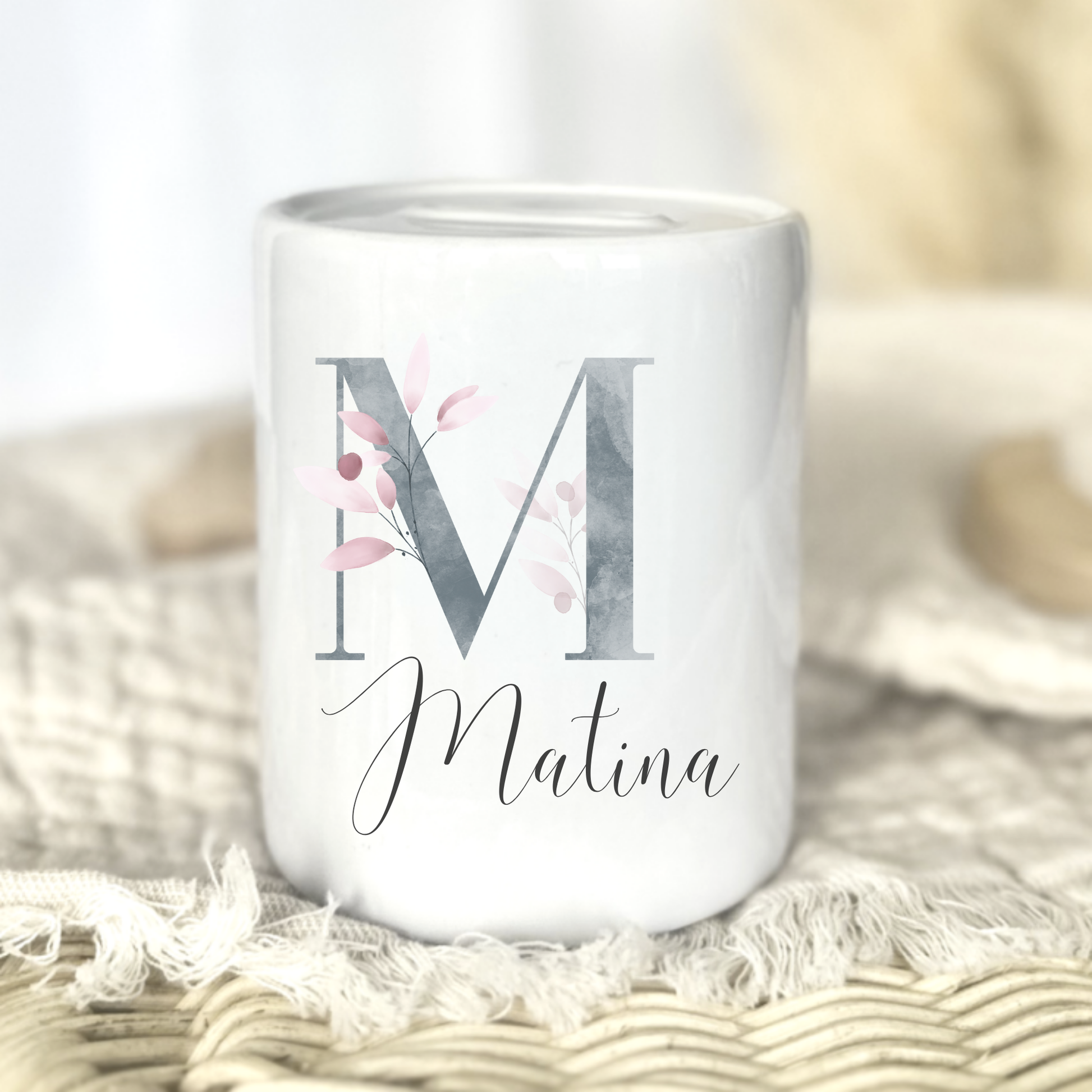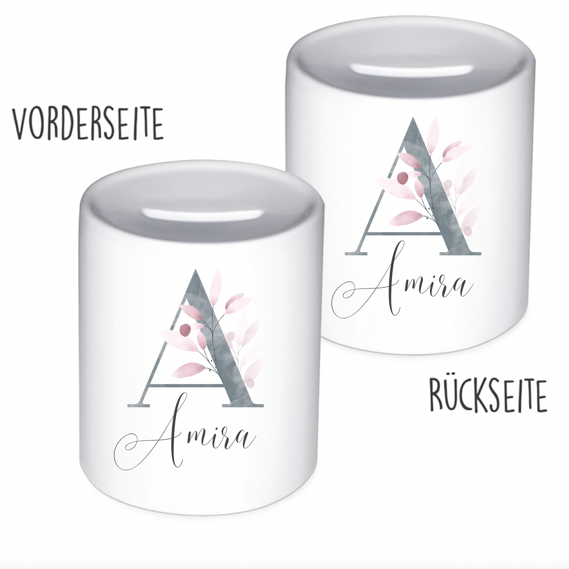Diese personalisierte Spardose aus Keramik mit Buchstabe und Namen ist ein stilvolles und liebevolles Geschenk zur Geburt, Taufe oder zum Kindergeburtstag. Das florale Buchstaben-Design verbindet Natürlichkeit mit feiner Eleganz – perfekt für kleine und große Herzensmenschen.