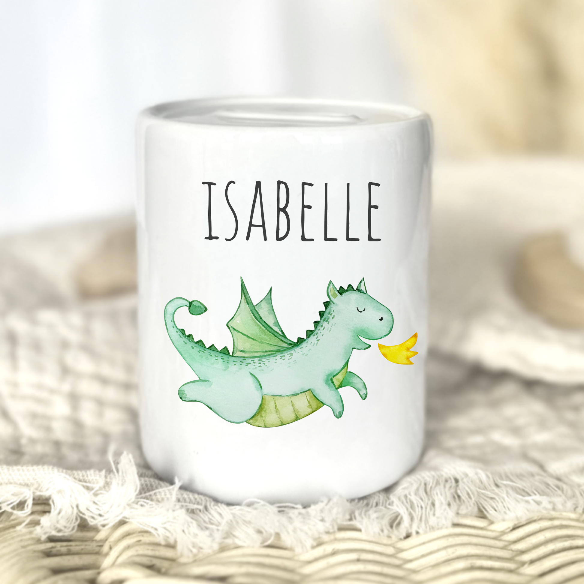 Diese personalisierte Spardose aus Keramik ist ein liebevolles Geschenk zur Geburt, Taufe oder zum Kindergeburtstag. Sie wird mit dem Namen des Kindes und einem fröhlich illustrierten Tiermotiv gestaltet – wahlweise Fuchs, Einhorn, Drache oder Wal.