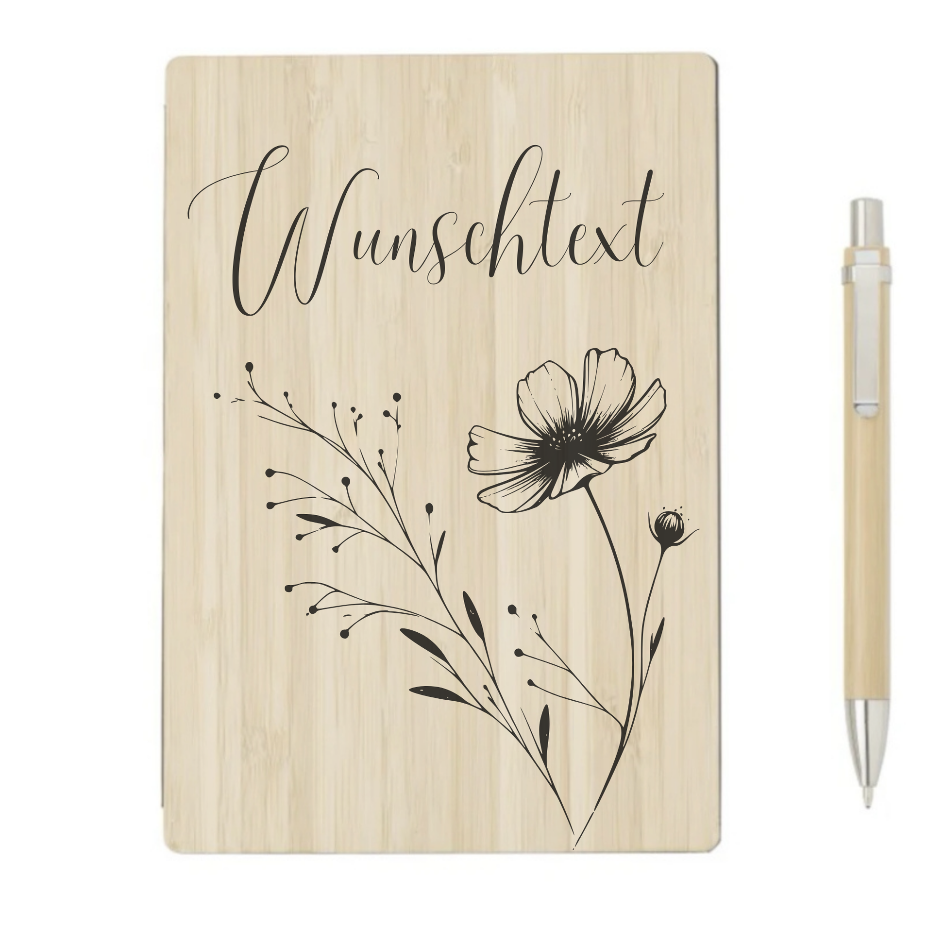 Dieses personalisierte Notizbuch aus Bambus trägt ein zartes Blumenmotiv, das für Leichtigkeit, Natürlichkeit und Wachstum steht. Es erinnert an die Schönheit des Augenblicks und schenkt Inspiration beim Schreiben, Skizzieren oder Reflektieren.