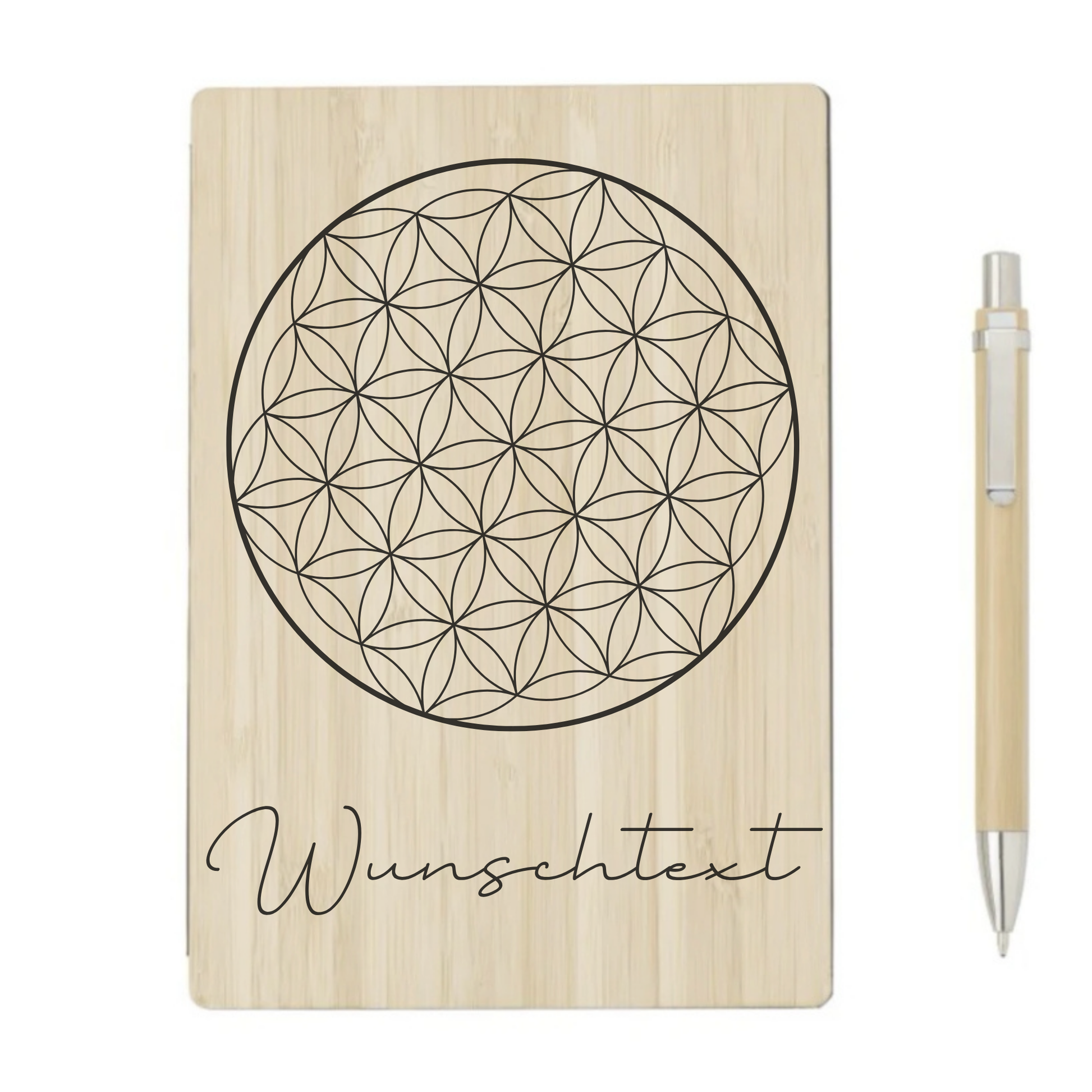 Dieses personalisierte Notizbuch aus Bambus trägt das kraftvolle Symbol der Blume des Lebens, das für Harmonie, Schutz und Energie steht. Es erinnert an die Verbundenheit aller Dinge und schenkt positive Schwingung beim Schreiben, Planen oder Reflektieren.