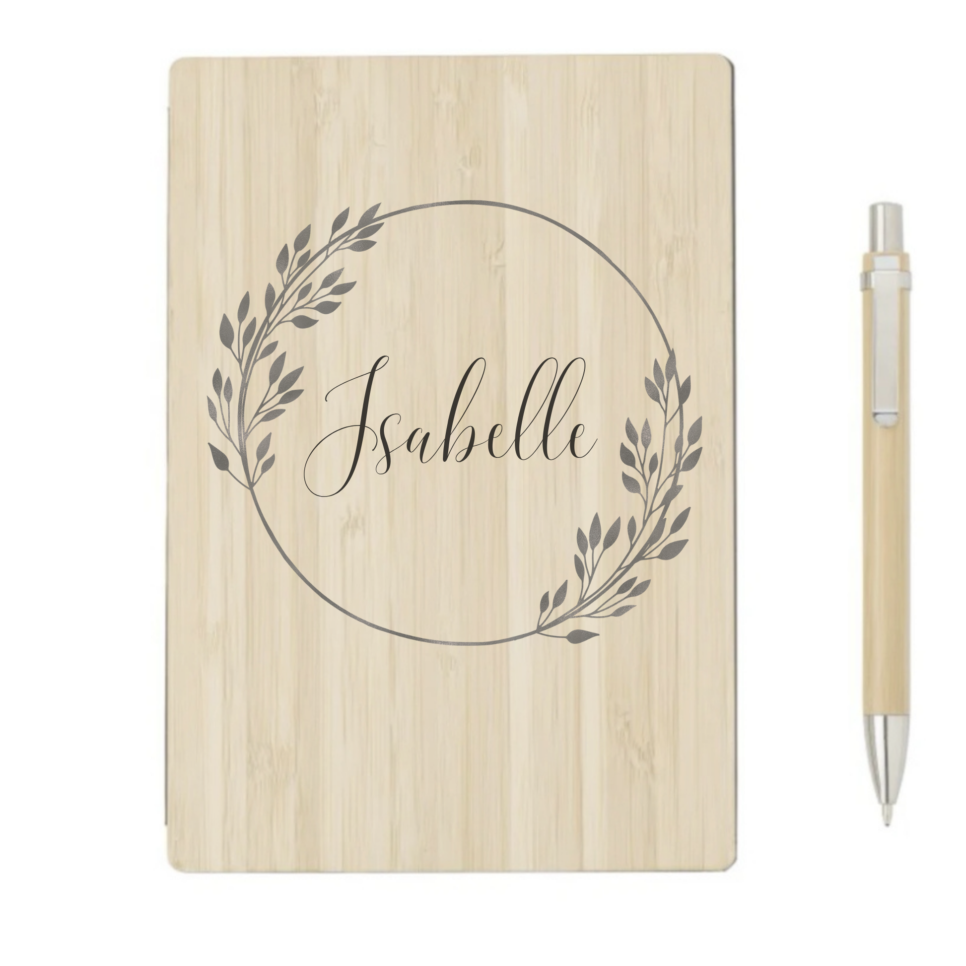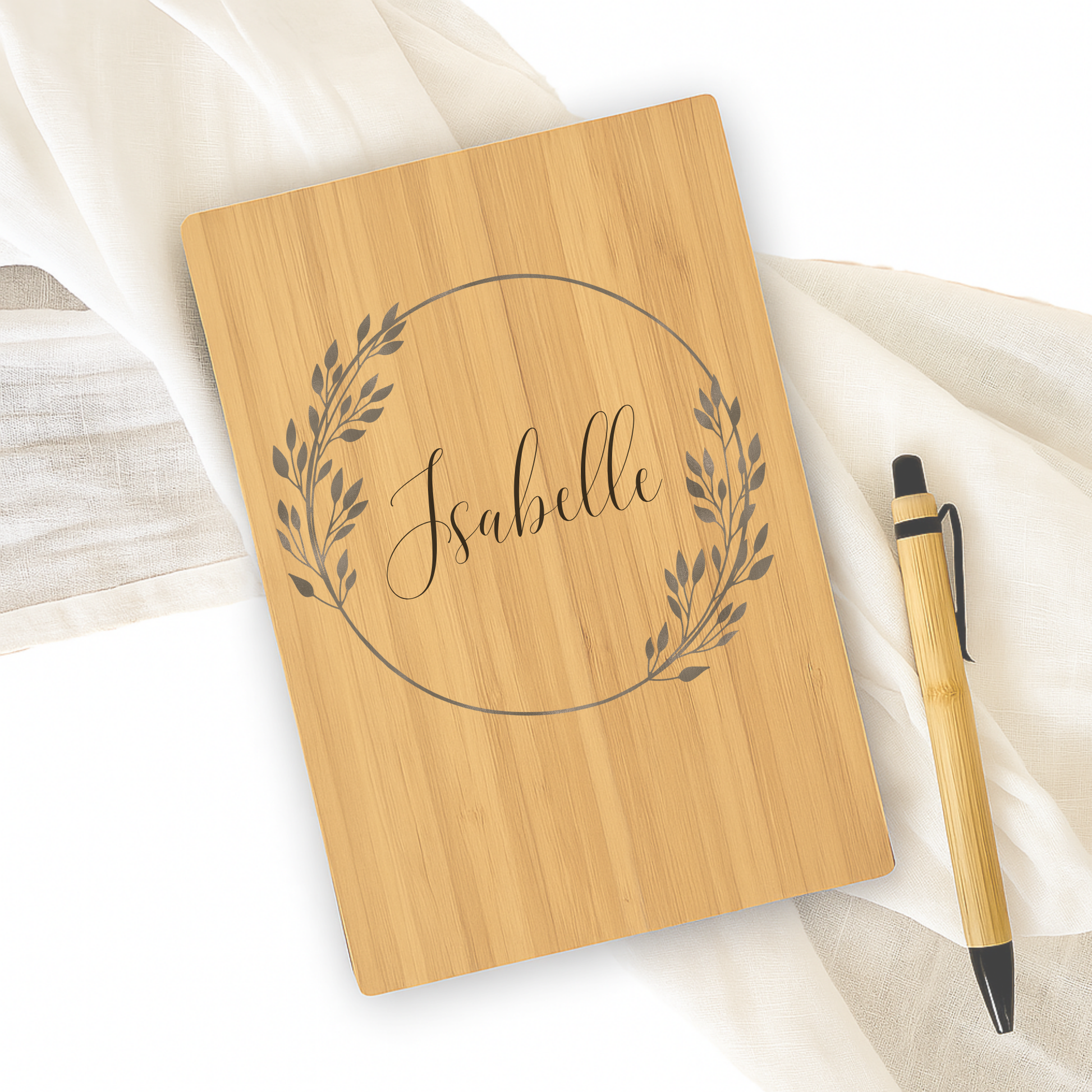 Dieses personalisierte Notizbuch aus Bambus zeigt einen zarten Blätterkranz, der für Wachstum, Harmonie und Verbindung mit der Natur steht. Es begleitet dich stilvoll beim Schreiben, Planen und Festhalten deiner Gedanken.