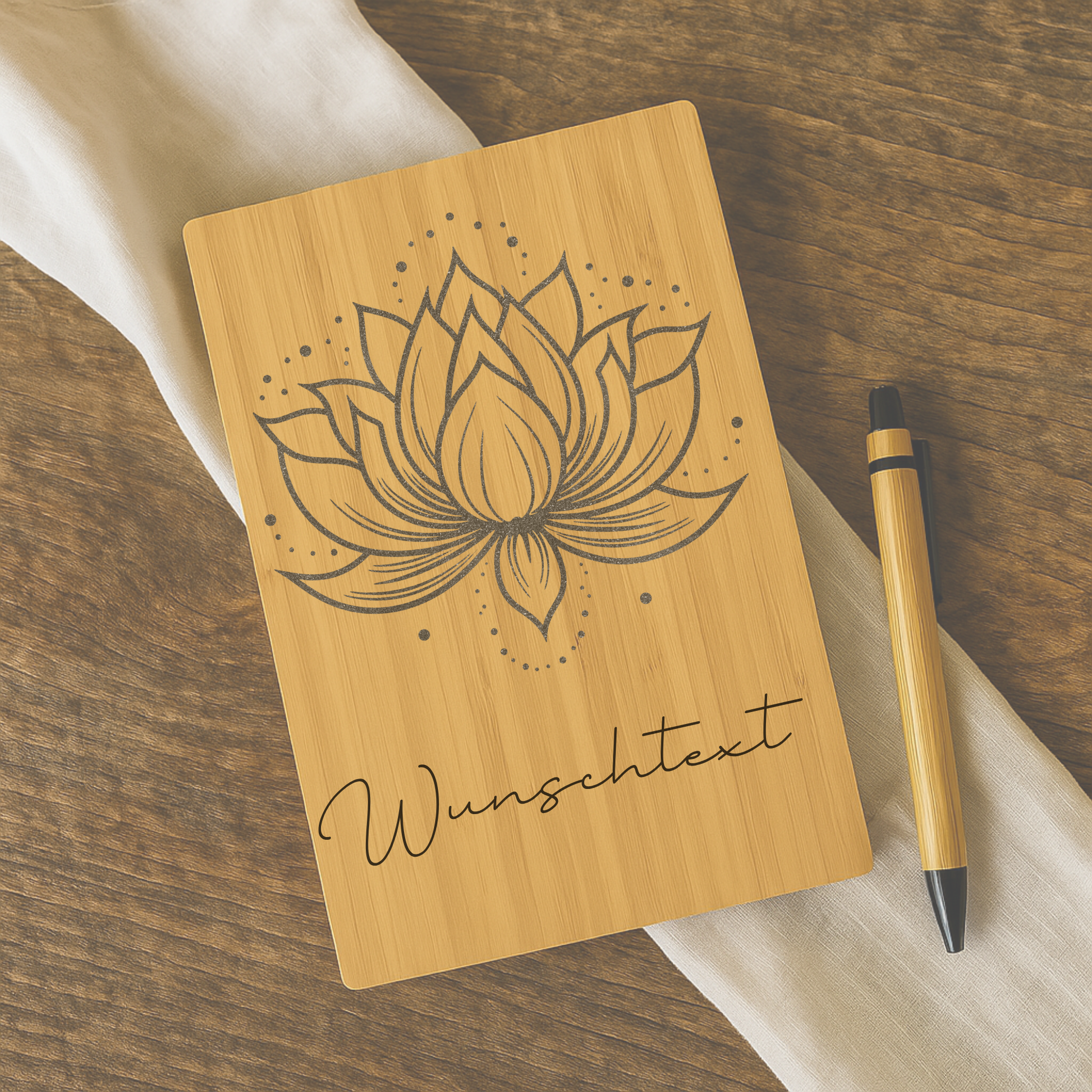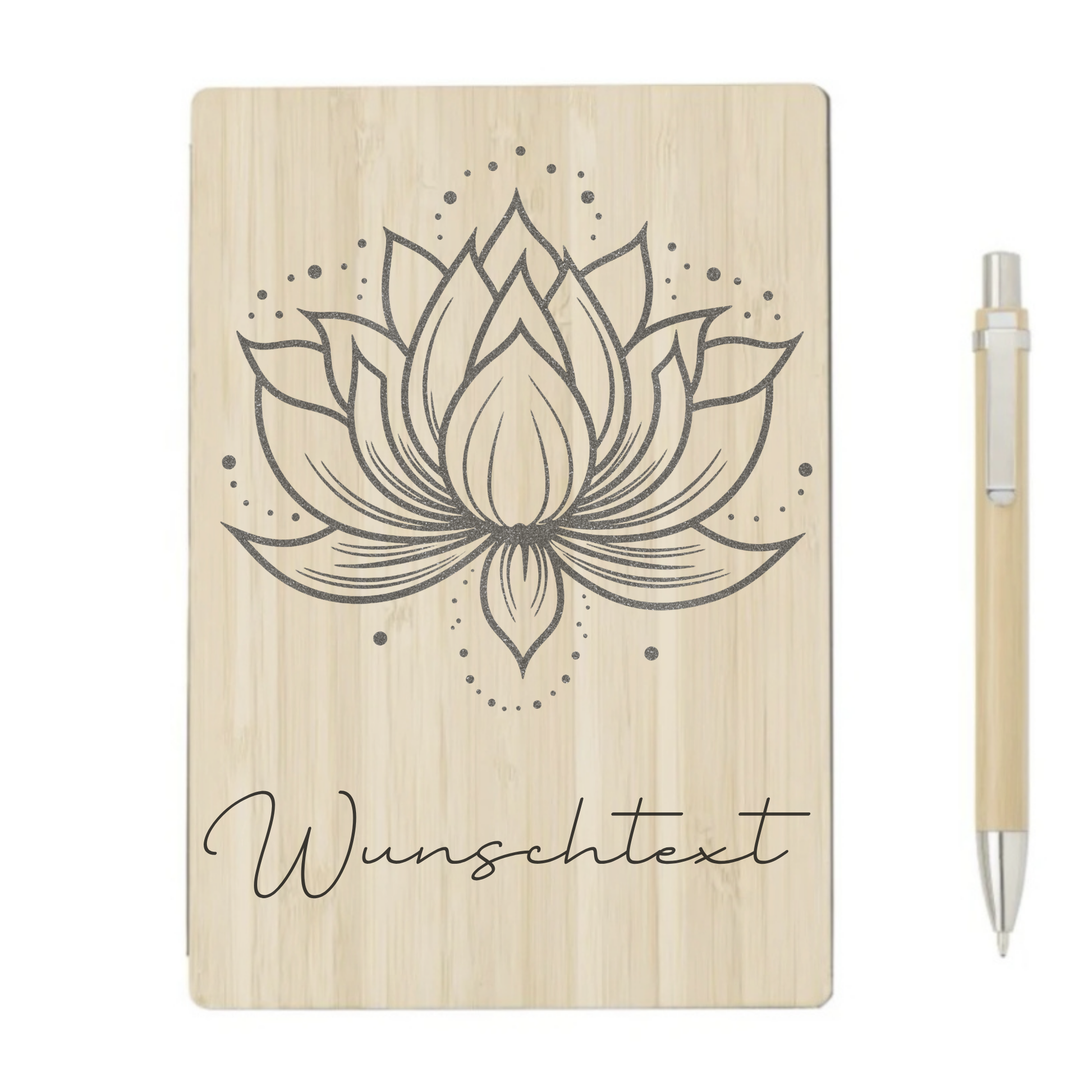 Das Notizbuch aus Bambus vereint Natürlichkeit, Achtsamkeit und Eleganz. Auf dem Einband erblüht eine fein gezeichnete Lotusblüte. Ein Symbol für Reinheit, Klarheit und inneres Wachstum. Darunter wird dein Wunschtext hochwertig aufgedruckt, wodurch jedes Stück zu einem persönlichen Begleiter wird.